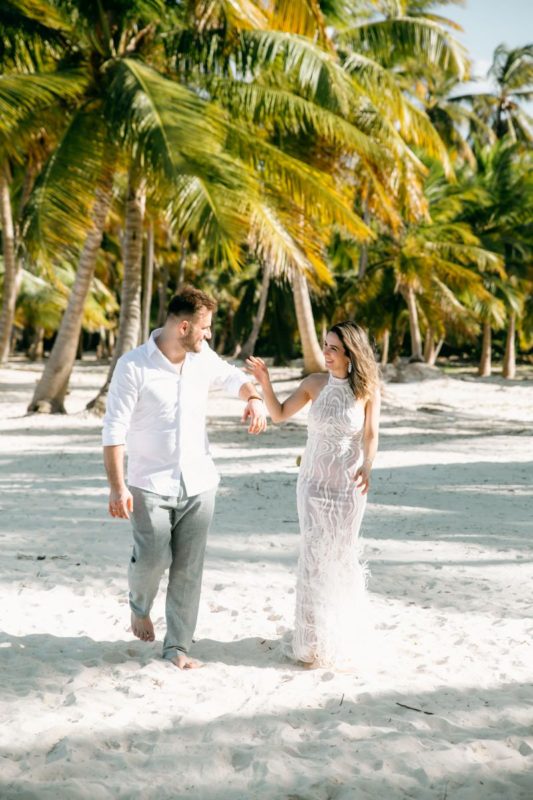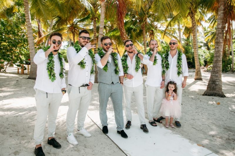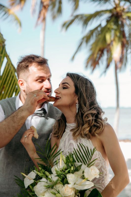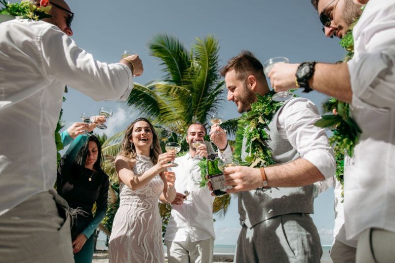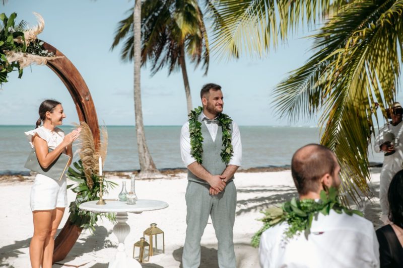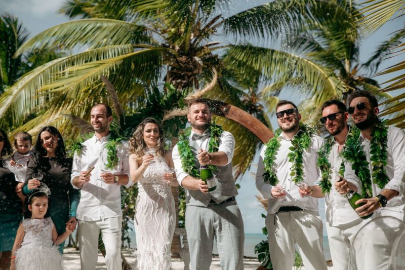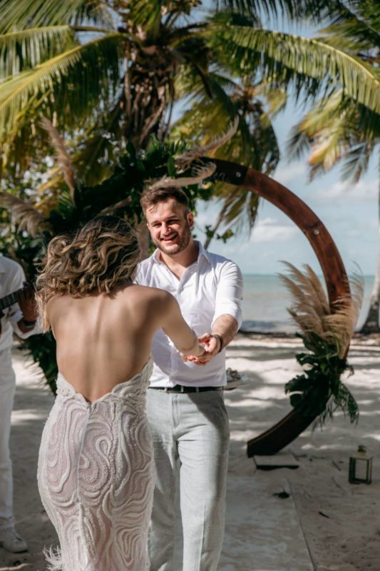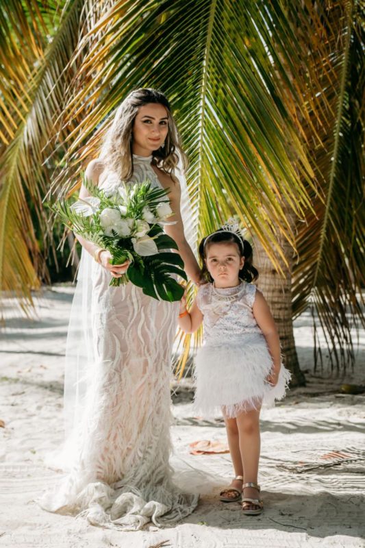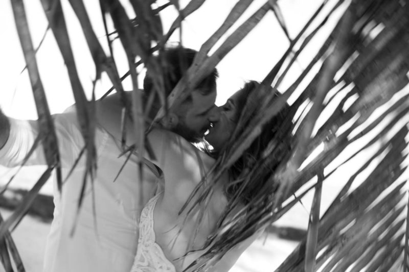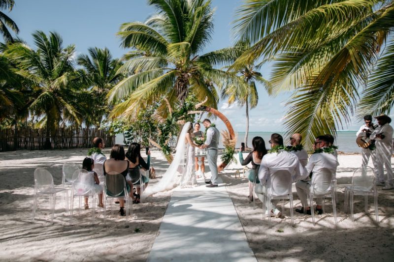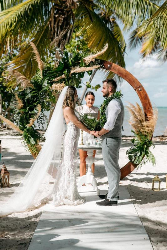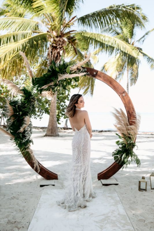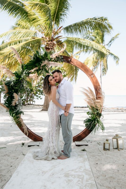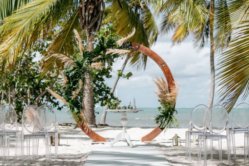 Gorgeous tiny wedding on a private beach.Tropical greenery, pampas grass, transparent details.