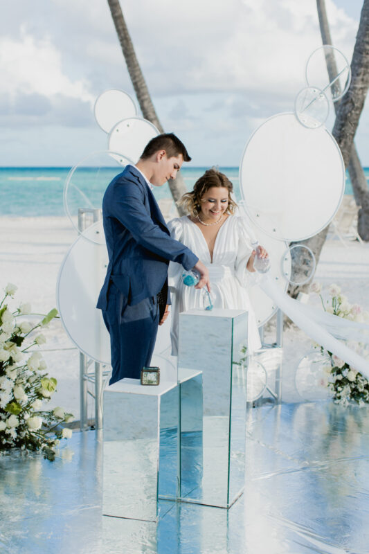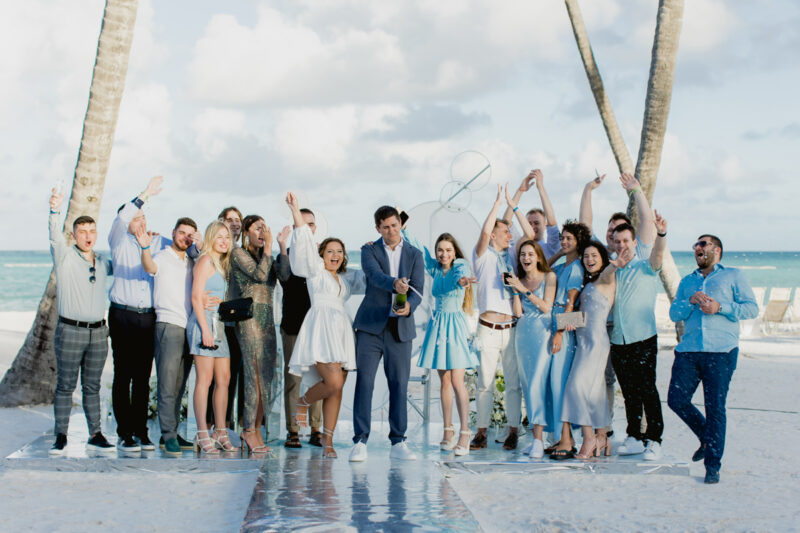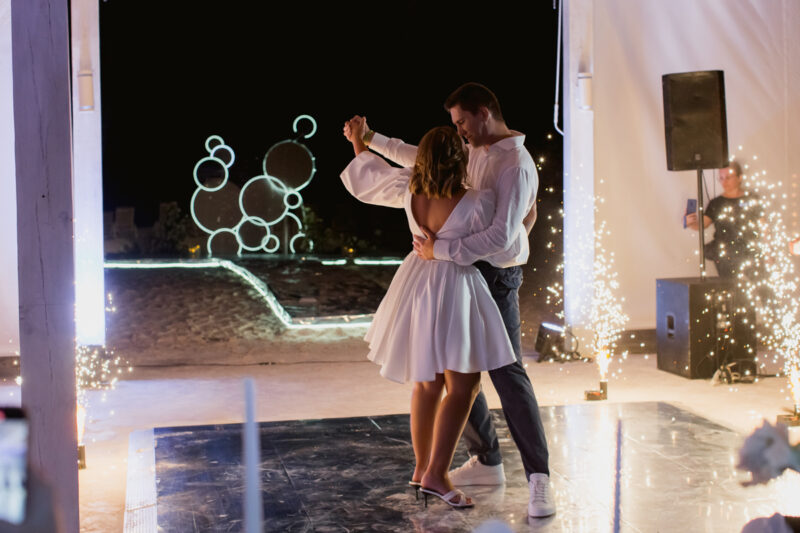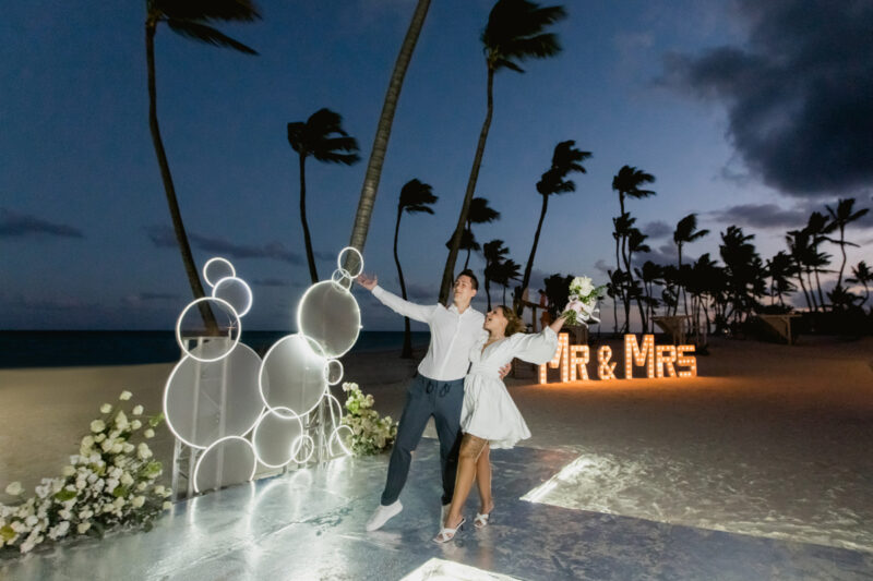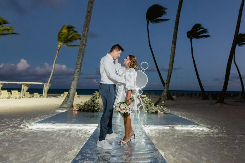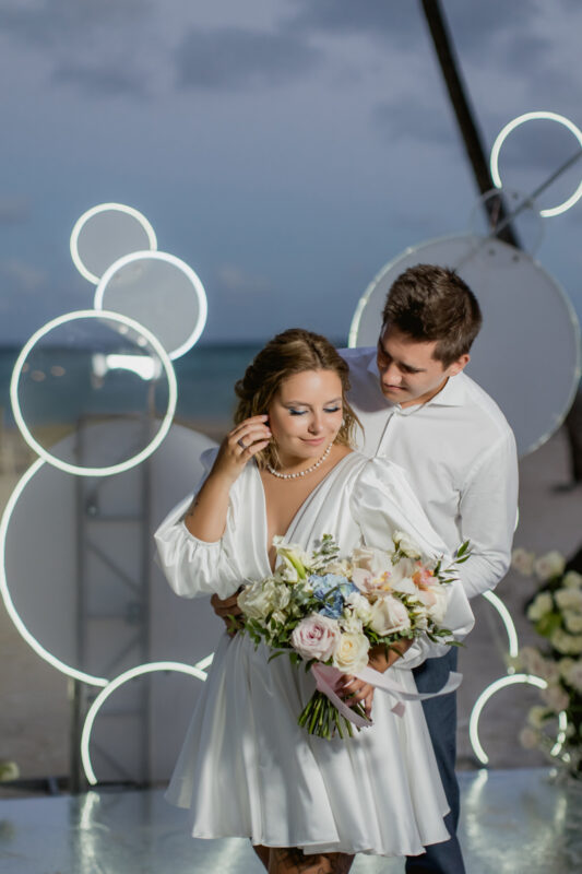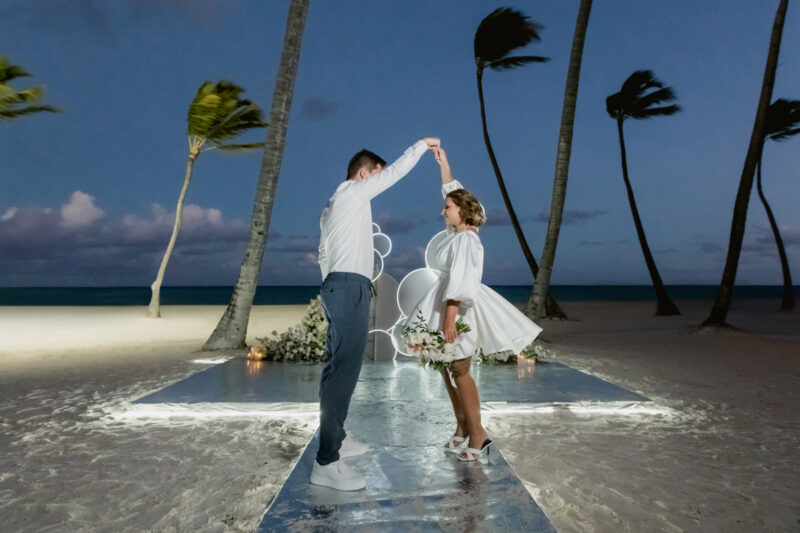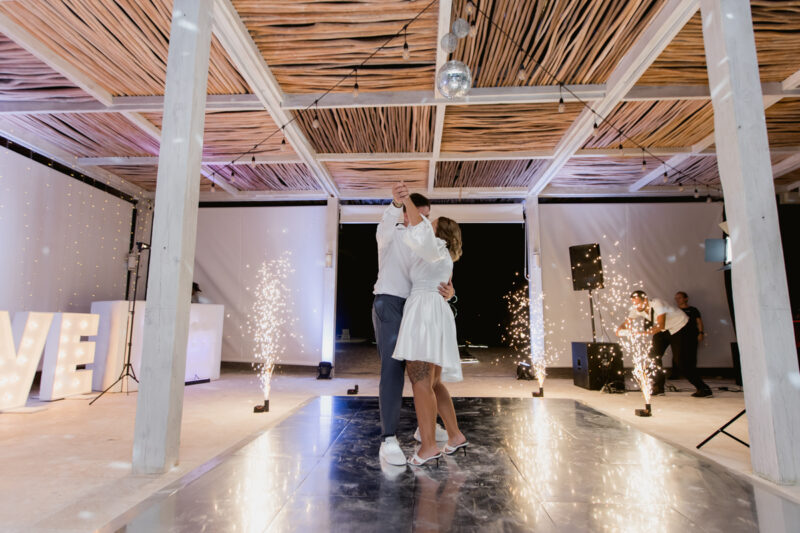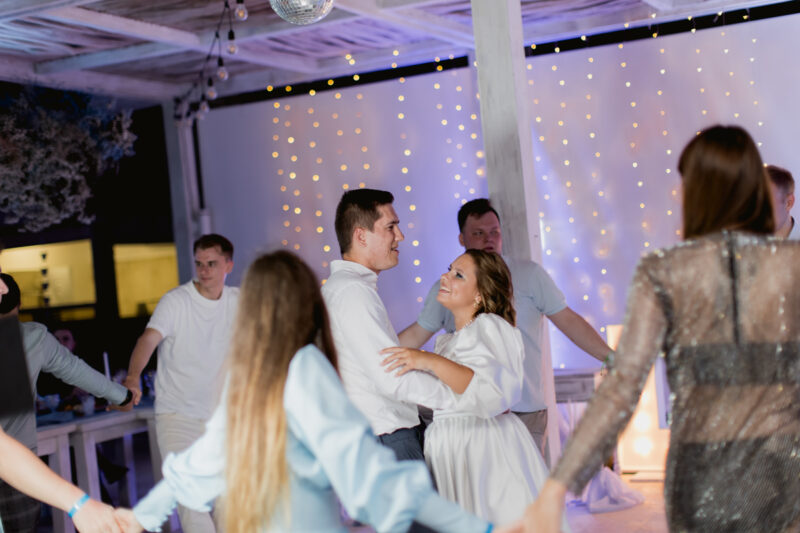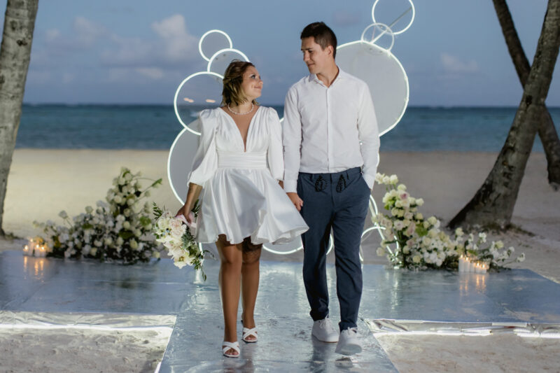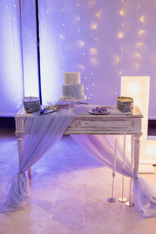 An intimate, stylish and so atmospheric wedding for a young couple from Ukraine. Bespoke illuminated backdrop arch, mirrored walkway and dance floor. Shades of dusty blue & Shine of mirrors & Disco balls