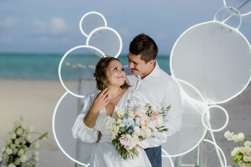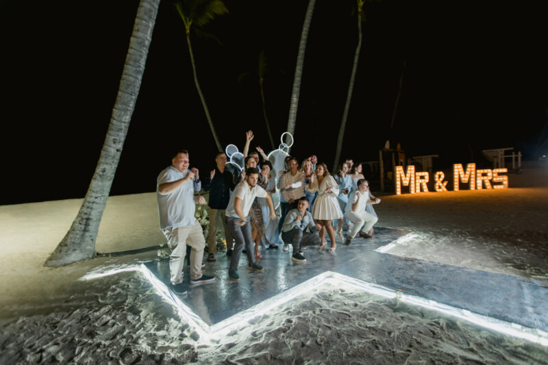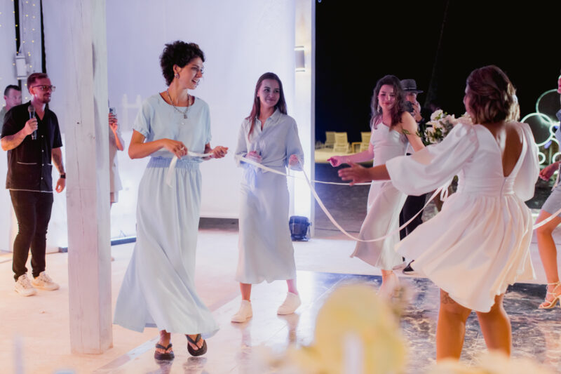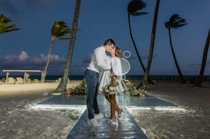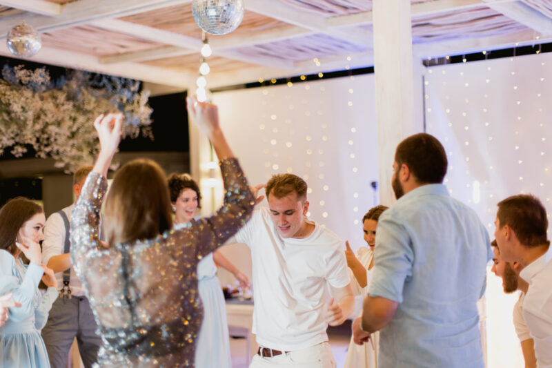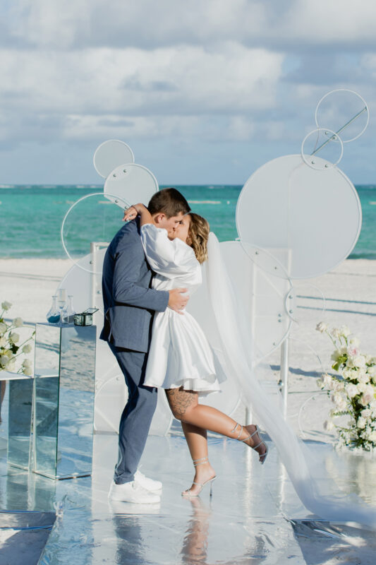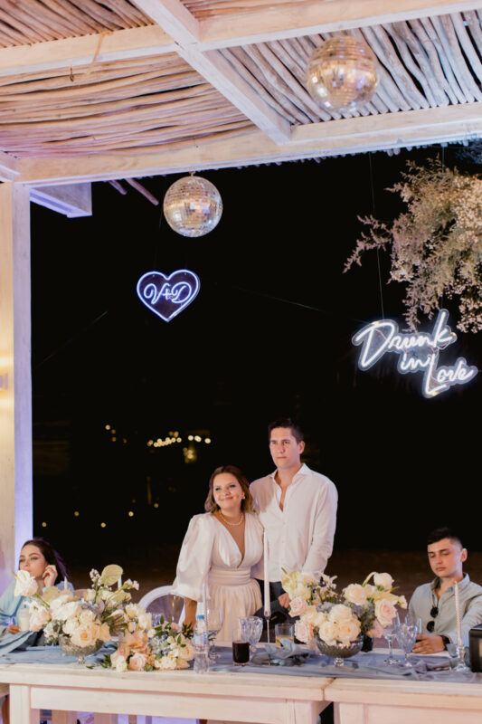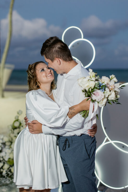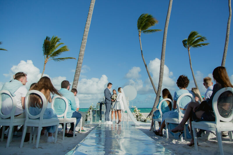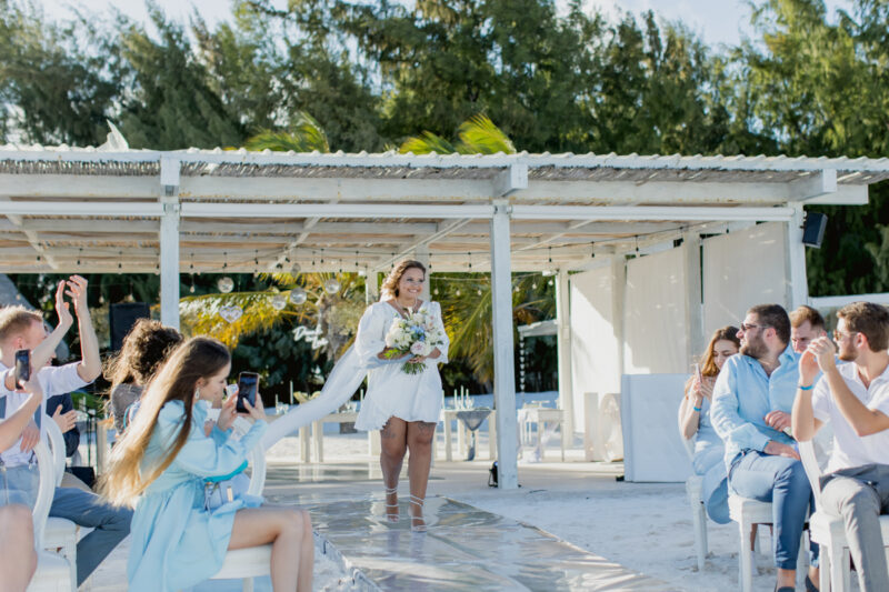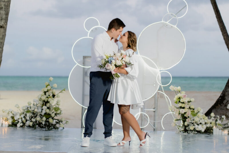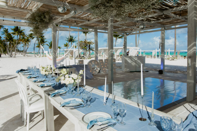 An intimate, stylish and so atmospheric wedding for a young couple from Ukraine. Bespoke illuminated backdrop arch, mirrored walkway and dance floor. Shades of dusty blue & Shine of mirrors & Disco balls