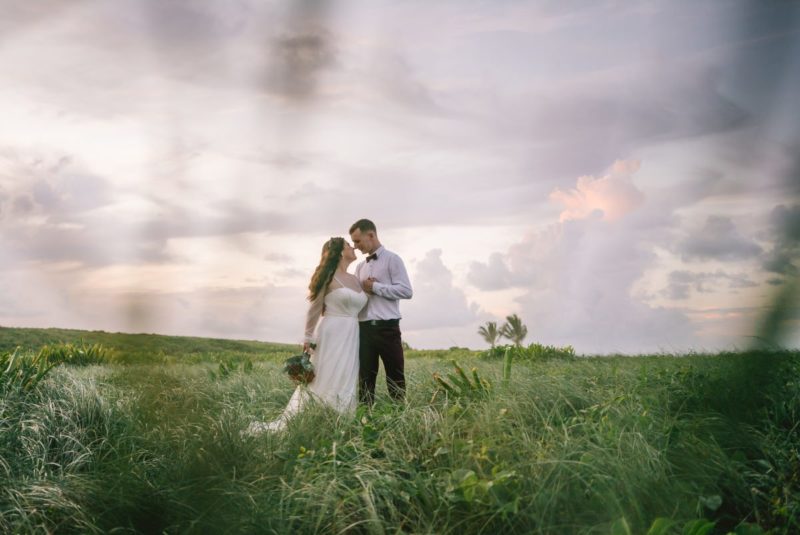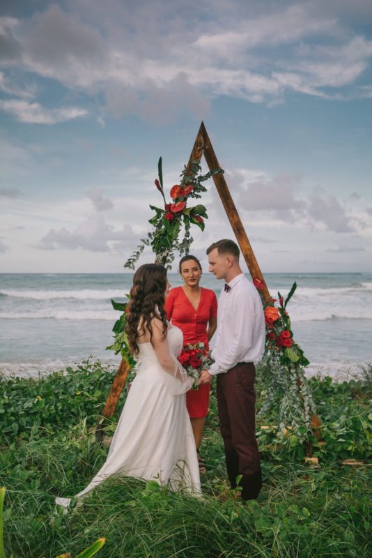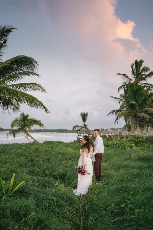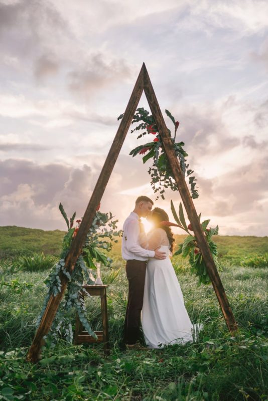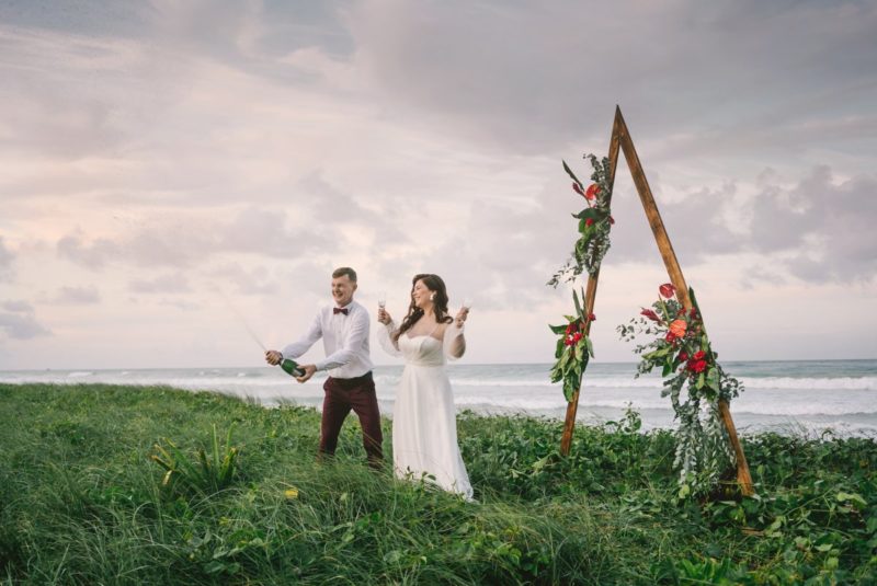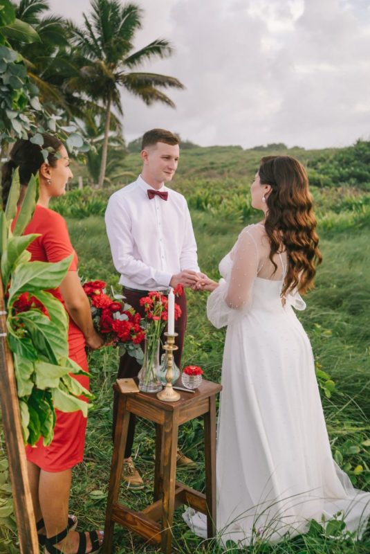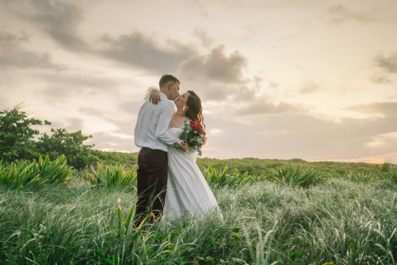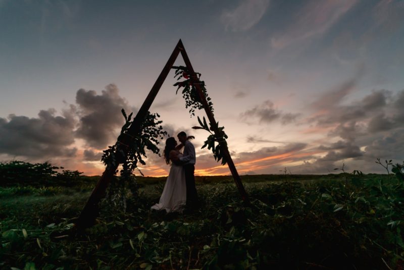 Красивая закатная свадебная церемония в поле под шум прибоя Атлантического океана.