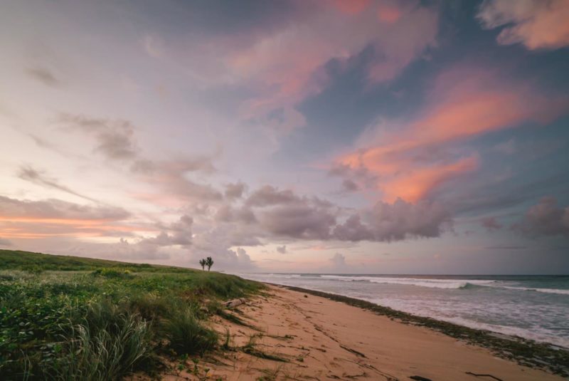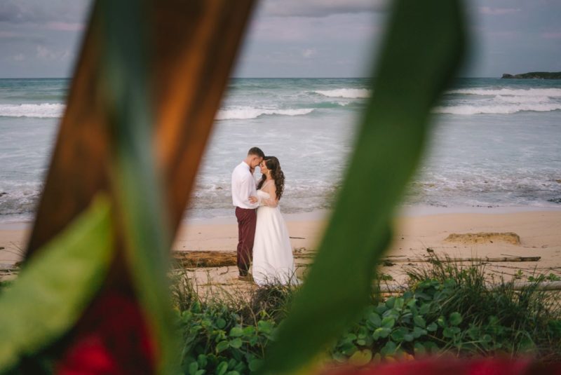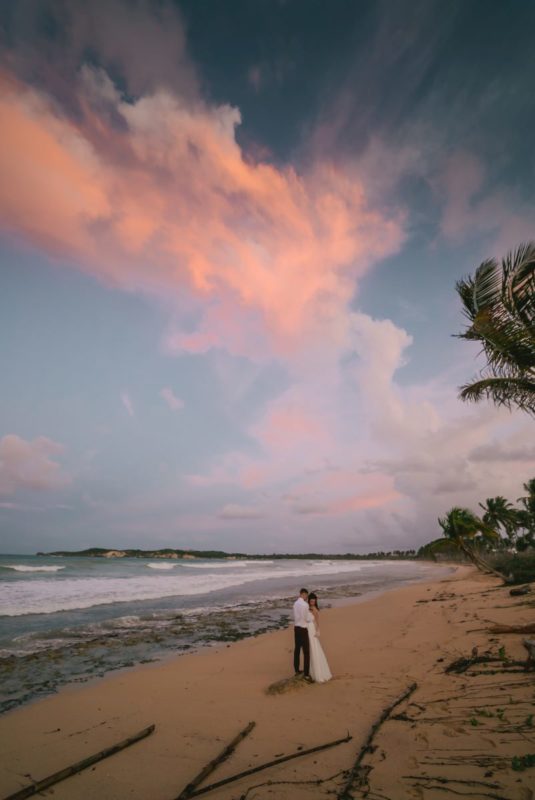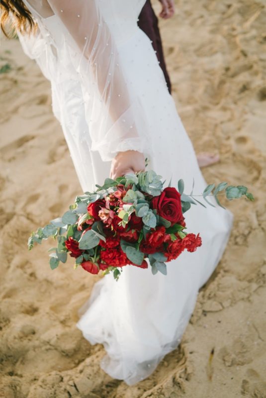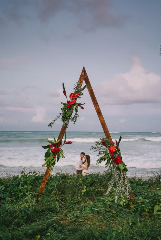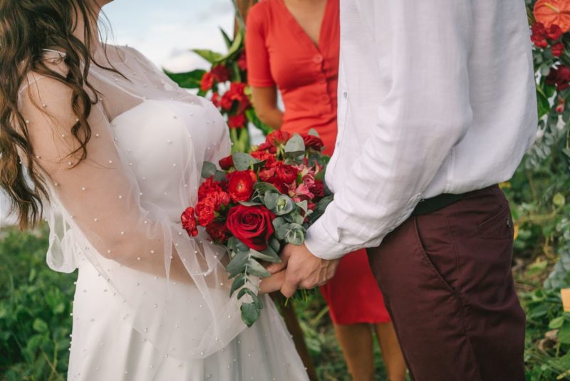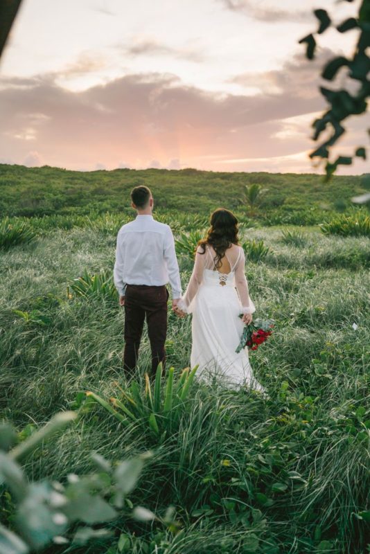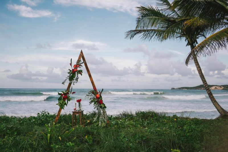 Красивая закатная свадебная церемония в поле под шум прибоя Атлантического океана.