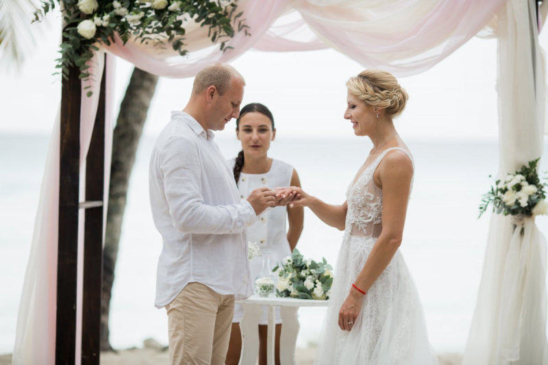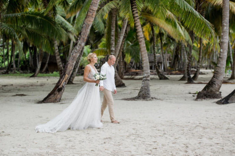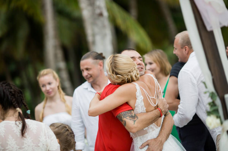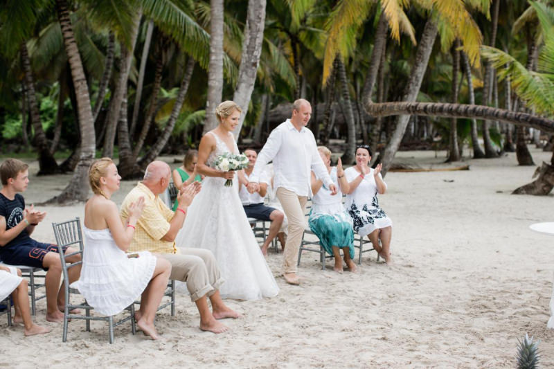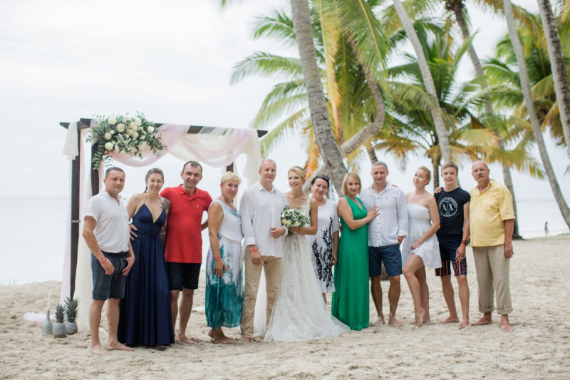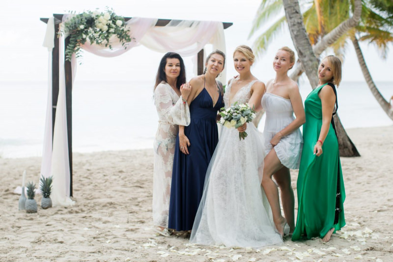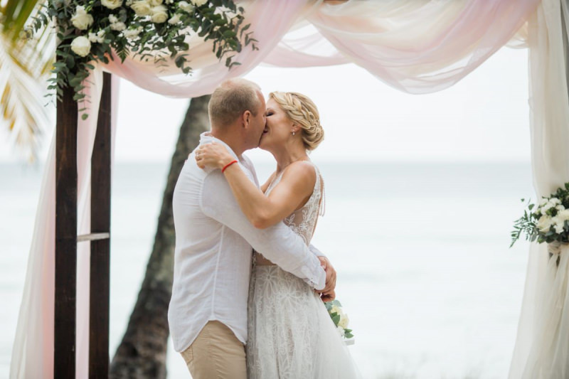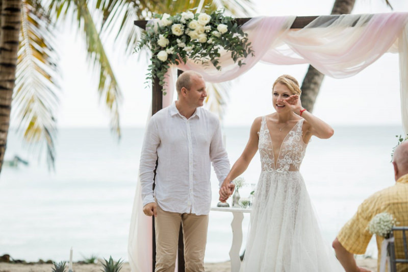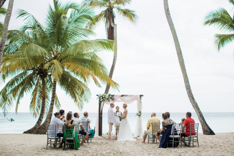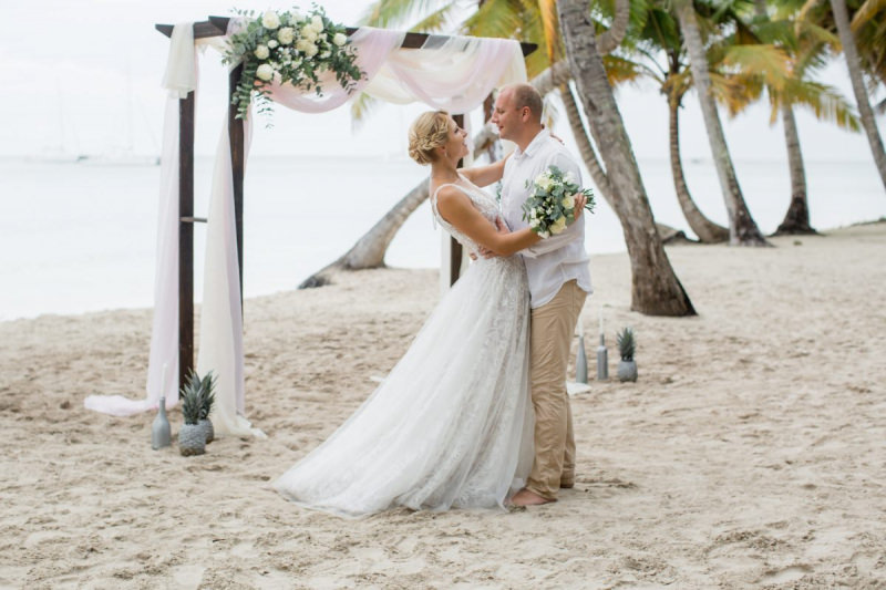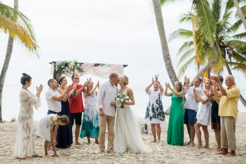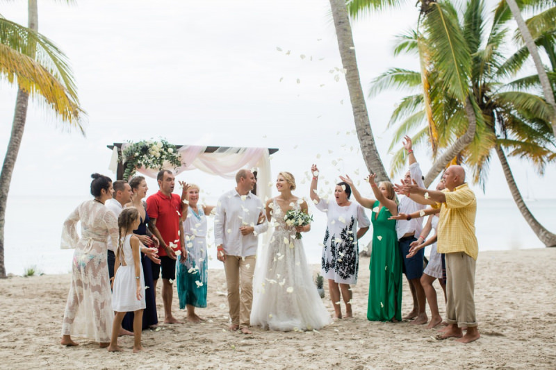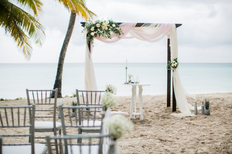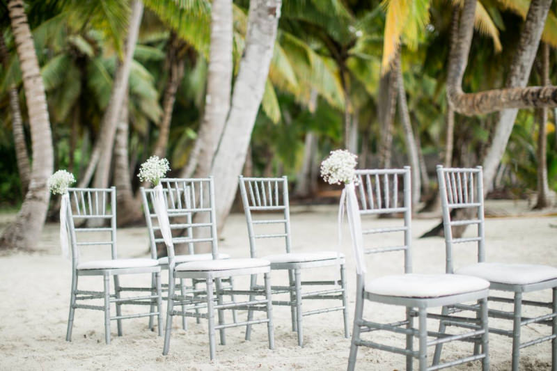 Пудрово-розовый & Белый цвета, серебряные акценты и облачка воздушной гипсофилы. Свадьба на 15 человек на тропическом острове Саона.